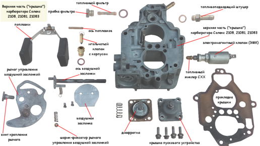 На примере карбюратора Солекс 21083 посмотрим из каких деталей состоят карбюраторы этой модификации (2108, 21081, 21083).