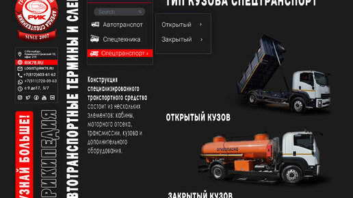 Конструкция специализированного транспортного средства состоит из нескольких элементов: кабины, моторного отсека, трансмиссии, кузова и дополнительного оборудования. Кузов предназначен для размещения груза или пассажиров во время транспортировки. Различают специализированные кузова для транспортировки наливных, навалочных, тарных, тяжелых, длинномерных грузов и другие. Основными характеристиками кузовов являются конструкция, предназначение и ключевые параметры. Например: цистерна (конструкция) для перевозки жидких нефтепродуктов (предназначение) объемом 15 кубических метров (параметр)...