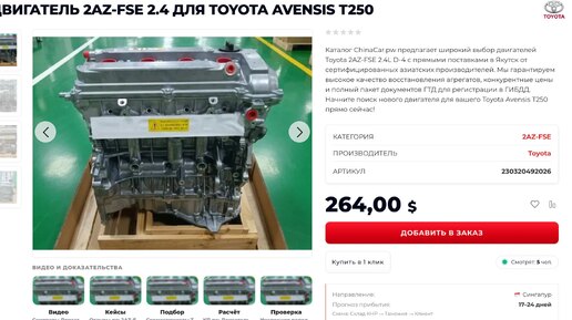 Двигатель Toyota 2AZ-FSE 2.4L D-4 для Avensis T250