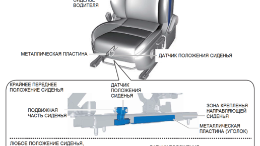 Датчик положения сиденья используется в двухступенчатой системе управления развертыванием подушек безопасности автомобиля Mazda CX-30 (DM). Датчик определяет и передает в модуль управления системой подушек безопасности SAS, информацию о том, что сиденье водителя находится либо в крайнем переднем положении либо в положении, отличном от него. Положение определяется путем изменения величины электрического тока элемента Холла, встроенного в датчик положения сиденья при его взаимодействии с неподвижной металлической пластиной (уголком)...