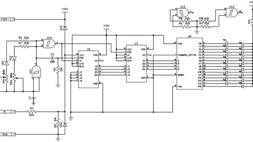 2. Тахометр с точечной шкалой на мультиплексоре CD4067 Шкала прибора состоит из 16 разноцветных диодов - по 4 светодиода одинакового свечения на сектор, где светодиоды синего свечения обозначают сектор малых оборотов (0-1600об/м), зеленые - средних (2000-3200об/м), желтые - повышенных (3600-4800), красные - условно предельных (5200-6400об/м). Шкала - точечная, т.е. количеству об/м соответствует 1 зажженный светодиод из 16. Схема тахометра выполнена на микросхемах серии К561 / CD40XX (рис.6) и содержит...