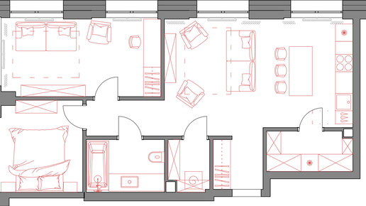 Дано: Вытянутые прямоугольные квартиры не самый удачный вариант для планировки. Здесь всегда есть огромная проблема — узкие длинные проходы/коридоры. Поэтому если у вас есть возможность и выбор, то отдавайте предпочтение квадратным формам квартиры. Портрет заказчика Кухня-гостиная В этом варианте мы видим прямую кухню без верхних шкафов с дополнительным хранением в острове. К тому же, при кухне образуется кладовка с системами хранения для всего, чего угодно🍏 Холодильник на основной кухне предлагаем ставить небольшой под столешницей...