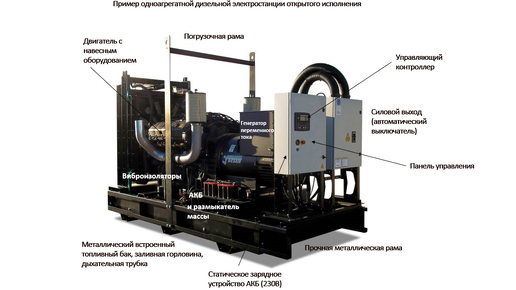 Дизельная электростанция (ДЭС) представляет собой генерирующее электроэнергию устройство, состоящее из дизельного двигателя и генератора переменного тока, сочлененных между собой и установленных на прочную металлическую раму...