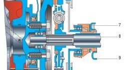 5.1. Сцепление Особенности конструкции Рис. 5.1. Сцепление в сборе: 1 – картер сцепления; 2 – маховик; 3 – болт крепления кожуха сцепления к маховику; 4 – ведомый диск; 5 – нажимной диск; 6 – кожух сцепления; 7 – муфта выключения сцепления; 8 – первичный вал коробки передач; 9 – вилка выключения сцепления; 10 – центральная нажимная пружина На автомобиле установлено однодисковое, сухое, постоянно замкнутое сцепление с центральной диафрагменной пружиной. Устройство сцепления показано на рис. 5.1. Рис...
