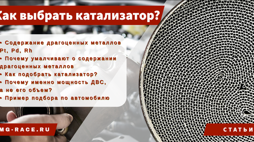 Содержание драгоценных металлов Pt, Pd, Rh В данной статье мы разберем, как правильно подобрать каталитический нейтрализатор С-MG по размеру, мощности ДВС и содержание драгоценных металлов. Самое важное в катализаторе - это драгоценные металлы. Благодаря ним в каталитическом нейтрализаторе происходит ускорение окислительно-восстановительных реакций, то есть сами драгоценные металлы являются катализаторами (ускорителями). Платина (Pt) является катализатором реакции окисления вредных углеводородов (CxHy) и угарного газа (CO) до безвредного углекислого газа (CO2) и водяного пара (H2O)...