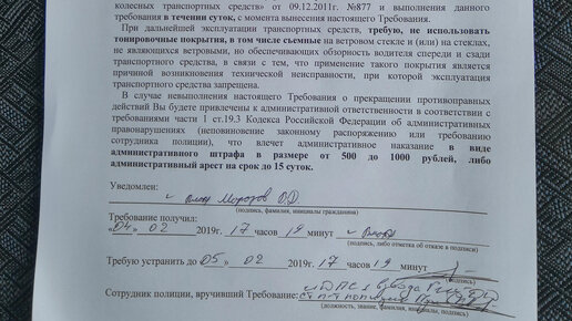 Предписание "требование" на устранение тонировки с авто.