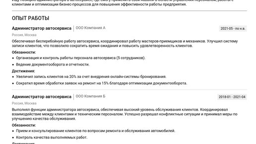 Нужен пример резюме администратора в автосервис? Изучение готовых примеров — лучший способ быстро составить действительно эффективное резюме и получить приглашение на собеседование. 🎯 Наша статья предлагает подробные , которые помогут вам понять, как составить документ, отвечающий требованиям работодателей. Вы найдете руководства для каждого раздела: от контактов и опыта работы до образования и актуальных навыков, а также узнаете, как адаптировать резюме под конкретную вакансию. Это руководство полезно как для начинающих, так и для опытных специалистов в автосервисе...