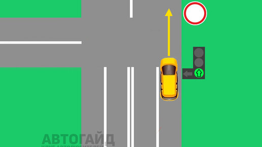 Разберём спорную дорожную задачку ПДД. Желтая машина подъезжает к перекрестку. Водитель уже подъезжает к своему дому, осталось лишь проехать на перекрестке прямо. Впереди светофор: основной сигнал светофора зелёный - он разрешает проезд перекрестка в прямом направлении. Однако не всё так просто. Уже за перекрестком висит дорожный знак, который с другими не перепутаешь: 3.2 - "движение запрещено". В этом как раз неоднозначность на дороге: с одной стороны светофор разрешает проехать прямо, но в то же время висит дорожный знак, который движение попросту запрещает...