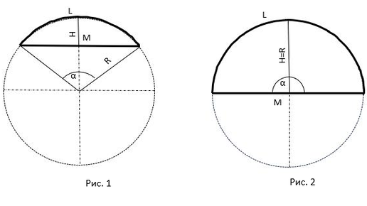 Дана дуга L и хорда M неизвестной окружности. Требуется определить максимальное расстояние между дугой и хордой H. Из тригонометрии известно: величина угла – центрального для произвольной окружности в радианах измеряется отношением длины дуги L, на которую этот угол опирается, к длине радиуса R этой окружности: α = L/R. Для проверки является ли хорда M диаметром этой окружности, а M/2, соответственно, ее радиусом, проверяем отношение L/(M/2). Возможны три варианта: первый вариант - отношение дуги...