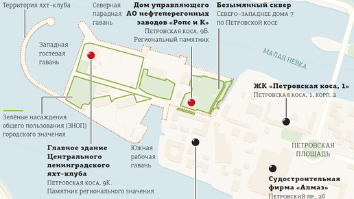 Частное учреждение "Санкт-Петербургский Речной яхт-клуб", которое осуществляло профильную деятельность на Петровской косе, 10 июля было ликвидировано по решению суда и в считаные дни исключено из Единого государственного реестра юридических лиц. Собственник ликвидированного ЧУ "Санкт-Петербургский Речной яхт-клуб" — ООО "Аврора" — утратил право бессрочного пользования земельным участком по адресу: Петровская коса, 9, но сохранил в собственности компании объекты недвижимости. Отношения не сложились...