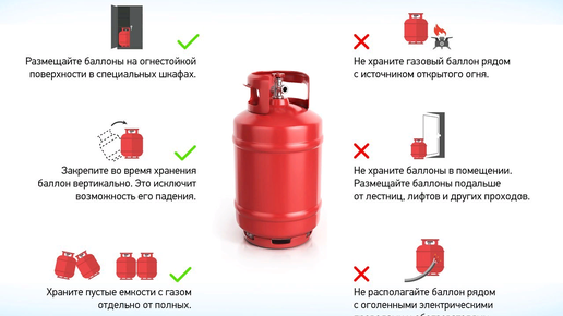 ПРАВИЛА БЕЗОПАСНОЙ ЭКСПЛУАТАЦИИ ГАЗОВОГО БАЛЛОНА Размещение баллонов Размещение газовых баллонов разрешается как снаружи, так и в квартирах жилого здания, имеющего не более двух этажей. В каждой квартире допускается устанавливать не более одного баллона. При этом баллоны должны соответствовать своему назначению, определённому стандартами и другими нормативными документами. Не разрешается установка баллонов в жилых комнатах и коридорах, в цокольных, подвальных помещениях и на чердаках, в помещениях без естественного освещения, у аварийных выходов, а также со стороны главных фасадов зданий. Снаружи...