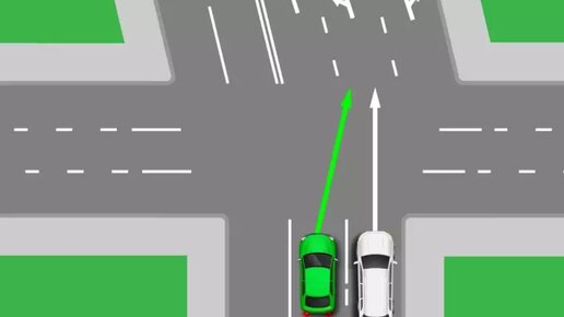При выезде с перекрестка 2 автомобиля претендуют на одну полосу. Кто-то должен уступить? Пробуем разобраться! Перед нами не обычный перекресток. Две полосы при въезде на перекресток превращаются в три при выезде. Продолжая движение по своим траекториям водители зеленого и белого собираются выехать в одну (среднюю) полосу. У кого из них преимущество? Конечно, таких вопросов у водителей быть не должно. Если перекресток имеет сложную конфигурацию, порядок движения на самом перекрестке дорожные службы должны показать разметкой...