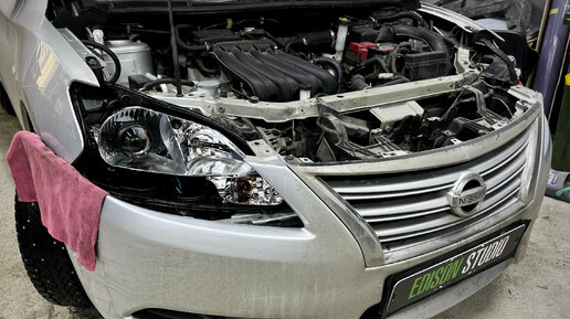 Всех приветствую! Сегодня у нас в студии Nissan Sentra. Штатно на автомобиле установлена обычная рефлекторная оптика, свет которой, скажем откровенно, посредственный. Наша задача, установить в фары современные светодиодные линзы и привести стекла в порядок. Состояние фар до начала работ: Демонтируем фары и бампер. Снимаем с них все навесное. Выкручиваем саморезы по канту, которые фиксируют стекло к корпусу, и отправляем фары в печь. Герметик в данном случае у нас термоплавкий и с отделением стекла не возникает никаких проблем...