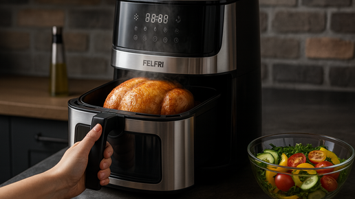 Утром не до готовки, вечером — сил мало, а хочется горячее и полезное без литров масла. Решение простое: хрустящая курица в аэрогриле — сочная внутри, румяная снаружи, и без долгой возни у плиты. Ниже — быстрый рецепт, шесть готовых смесей специй и советы, чтобы получалось стабильно вкусно. Посмотреть удобные модели аэрогрилей можно здесь: витрина FELFRI. Подходит: Не подойдёт: Ингредиенты на 3–4 порции Шаг 1. Подготовка (5–7 минут) Шаг 2. Готовка (18–25 минут) Шаг 3. Доведите до хруста (2–4 минуты) Курица получается сухой...