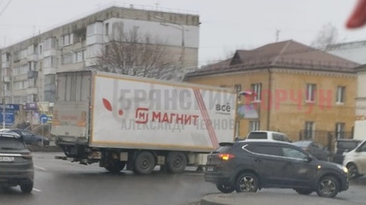 Дальнобойщик пытался завернуть на 180 градусов (!), съезжая с высокого путепровода на Втором Брянске в направлении улицы Шолохова. Но не смог. После неудачного дорожного манëвра водитель грузовика, раскрашенного в фирменные корпоративные цвета торговой сети “Магнит”, расписался в своей беспомощности. Он, похоже, не придумал ничего лучше, чем отметить и… бросить фургон-полуприцеп сразу за путепроводом – прямо посреди дороги...