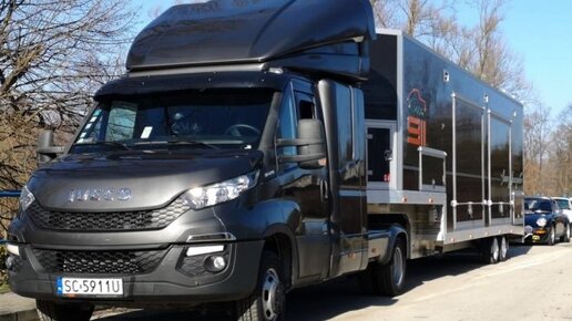 Этот Iveco Daily имеет форму тягача, с обозначением двигателя "210", помимо всего он привлекает внимание своей спальной кабиной. Сзади цепляется полуприцеп, который был построен для транспортировки старинных ретро-автомобилей. Здесь не будет никакого преувеличения в утверждении, что это очень интересный и уникальный автомобиль. Владельцем описанного Iveco является компания Car 911 из Ченстоховы(город в Польше), они занимаются реставрацией классических автомобилей Porsche. Компания нуждается в таком транспорте, из-за частого посещения всяческих выставок или гонок старинных автомобилей...