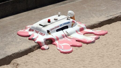 Отовариваясь в фургонах с мороженым, можно столкнуться практически с чем угодно. От танцев с шестом прямо на крыше «ларька на колесиках» и бара с алкогольными напитками до физиономии злобного клоуна. Этот обзор посвящен фургонам с мороженым, всемирно известным за счет креативного дизайна или уникального торгового предложения. Бронзовая инсталляция «расплавленный фургончик с мороженым» – дело рук канадского художника Ореста Кивена (Orest Keywan). По его словам, столь гротескный образ навеян впечатлениями от австралийской жары...
