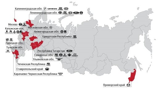 Хочу рассказать, что в России очень много заводов по производству автомобилей. Многие Вы знаете. Некоторые закрылись. Некоторые существуют до сих пор. Вот список городов и заводов по производству легковых автомобилей. 1. Санкт-Петербург: – завод Hyundai Motor Manufacturing Rus LLS. – завод Ниссан Мэнуфекчуринг Рус. – завод Тойота Мотор. – завод General Motors. 2.   Всеволожск: – Ford-Sollers. 3. Калининград: – Завод АВТОТОР. 4.   Москва: – ЗАО Рено Россия. 5.   Солнечногорск. Московская область: – Завод Mercedes-Benz Manufacturing Rus...