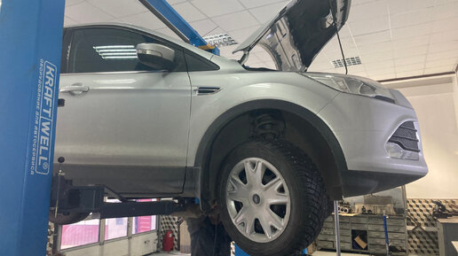 FORD KUGA серебристый 2015г.в 94000км Клиент приехал с жалобой на посторонний звук от выхлопной системы. При диагностике выявлено что пробита гофра приемной части глушителя. Производится установка новой с пропусканием подрамника...