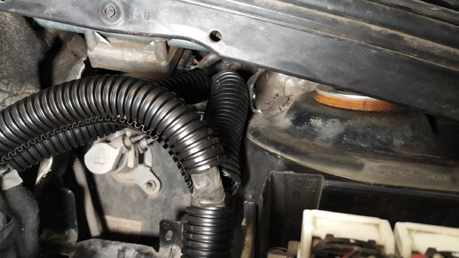 Отрезал кусками и по месту надевал, гофра в диаметре чуть больше и поэтому при конечной установке подгибал один край гофры под другой. Нигде ничего не зажато и не мешает, сидит хорошо. И главное — недавние снегопады с дождём подтвердили что теперь жгуты с проводами сухие, несмотря на сырость под жабо...