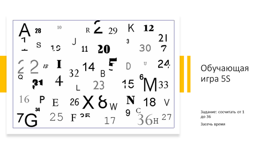 При обучении системе 5S необходимы закрепляющие материалы, визуализирующие эффективность системы. Предлагаю игру с цифрами. Ее плюс - нет необходимости в дополнительной подготовке учебных материалов, экономия на расходных материалах. Задание игры сосчитать цифры от 1 до 36 (по порядку). Засекайте время. Можно на конкурс, кто быстрее. После спросите, что препятствовало эффективному подсчету. 1. Сортировка, необходимо убрать лишнее, то есть убрать буквы. 2. Упорядочивание. Добавляем 4 линии, у каждой цифры своя ячейка по возрастанию...