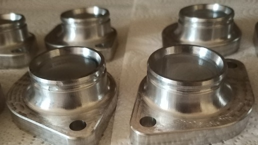 Будет около 70 фото и видео. Больше года назад обратился клиент изготовить переходники для карбюратора на мотоцикл, заказал пару комплектов. Через год от него обратился ещё один клиент и ему их надо было много. Детали в изготовлении не простые, обработка с двух сторон, и с некоторыми нюансами, о которых ниже. 2. Так они выглядят в готовом виде. 3. Для первых черновых операций используем фрезу с dlc покрытием 8x24x60мм Так как сами детали высотой около 30мм, фрезеруем поэтапно, на 24мм глубины увеличивая отступ от стенки - чтобы не терется хвостовиком...