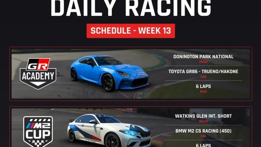 GR Academy - Donington Park National - Toyota GR86 - Trueno/Hakone - 6 Laps BMW M2 Cup - Watkins Glen International Short - BMW M2 CS Racing (450) - 6 Laps German Classics - Nurburgring Sprint - BMW M3 E30 Sport Evo - 15 Minutes Hot Hatch Heats - Paul Ricard 3A - Hyundai i30 N Hatchback - Drive-N...