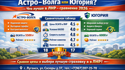 С 2024 года страховой полис ОСАГО в Луганской Народной Республике стал не просто формальностью, а юридическим щитом каждого водителя. На рынке ЛНР сегодня лидируют два игрока с федеральным статусом: СК «Астро-Волга» и ГСК «Югория». Какая компания быстрее платит при ДТП? Чей базовый тариф в Луганске ниже? И где оформить полис, чтобы он гарантированно «бился» по базе РСА? В этом материале мы проведем детальный сравнительный анализ. ✅Оформить ОСАГО онлайн ✅ Скидка до 30% для пенсионеров и инвалидов ✅Защита от дронов ✅Стоимость ОСАГО от 2500 руб...