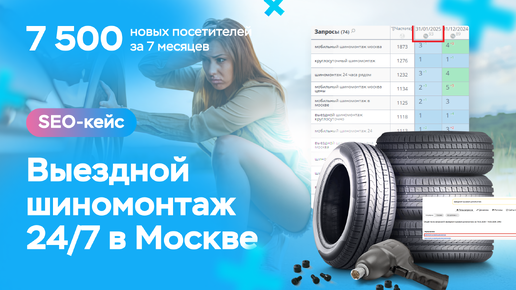 SEO-продвижение сайта выездных автоуслуг «Мобильный шиномонтаж 24/7 в Москве». Рост посетителей с 0 до 7,5 тысяч, конверсия 4%