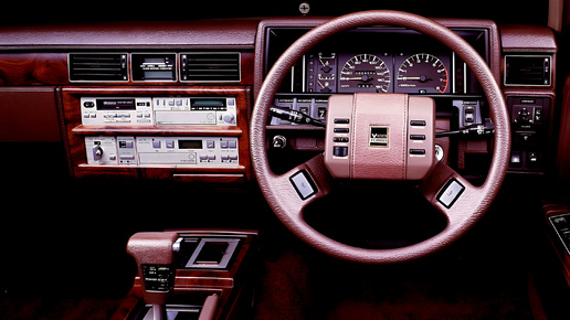 Интерьеры японских авто 70-80-х годов всегда приковывали моё внимание. Сиденья широкие и мягкие, с красивой отделкой. Много бархата или велюра светлых тонов и ярких акцентов типа красного. Передняя панель просто "залипательная", с кучей разных кнопочек и рукояток. Много блестящего хрома и деревянных вставок. Сразу видно, что все тщательно продумано и сделано, с любовью. Сел в такую машину - и сразу кайфуешь, не хочется вылезать. Флагманский седан бизнес-класса, производившийся с 1984 по 1987 год...