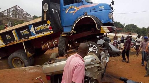 Чудеса вождения от африканских автомобилистов. На автостраде в нигерийском штате Эдо водитель грузовика налетел на легковушку и мотоцикл. На удивление в ДТП никто не пострадал. Возможно потому, что судя по надписи на кузове грузовик принадлежит самому Иисусу Христу...