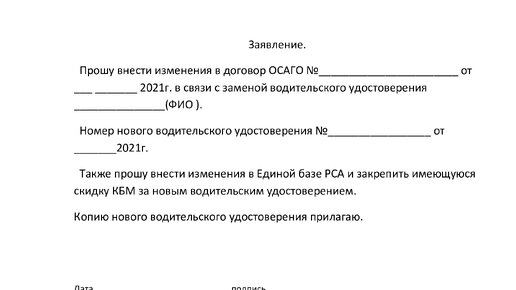 Как правильно написать заявление в страховую компанию при замене водительских прав для сохранения скидки по ОСАГО.