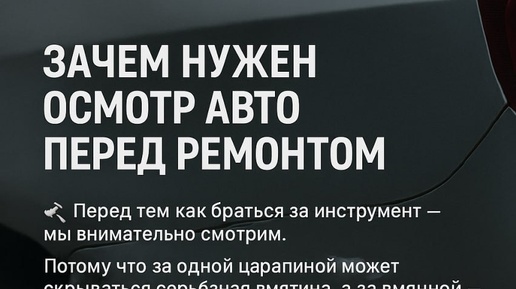 📌Зачем нужен осмотр авто перед ремонтом 🛠 Перед тем как браться за инструмент — мы внимательно смотрим. Потому что за одной царапиной может скрываться серьёзная вмятина, а за вмятиной — нарушение геометрии кузова. ⠀ 🔍 Осмотр — это первый и самый важный шаг в кузовном ремонте. Он нужен не для галочки, а чтобы: – точно определить масштаб повреждений, – выявить скрытые дефекты, – составить реальный план ремонта и рассчитать стоимость...