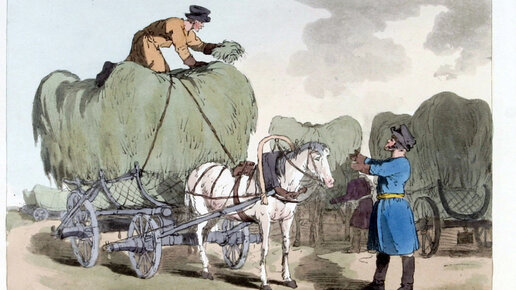 Использование телег для перевозки грузов в начале XIX века по рисункам Аткинсона