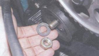 Предварительно снимите ремень привода распредвала. 1.Для замены натяжного ролика отверните гайку его крепления, снимите шайбу, а затем и натяжной ролик со шпильки. 2. Под натяжным роликом установлено дистанционное кольцо.