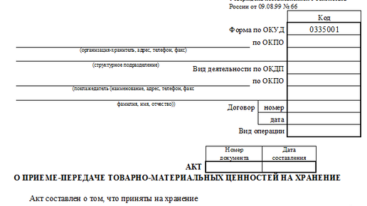 Особенности использования формы МХ-1 Для оформления факта передачи имущества на хранение профессиональным и непрофессиональным хранителям потребуется оформить первичный документ. Лучшим вариантом документирования передачи ценностей на хранение (хотя и необязательным для применения) является использование акта приема-передачи ТМЦ по унифицированной формы МХ-1, утвержденной постановлением Госкомстата РФ от 09.08.1999 № 66. Предпочтительно оформление операции передачи на хранение по форме МХ-1 потому,...