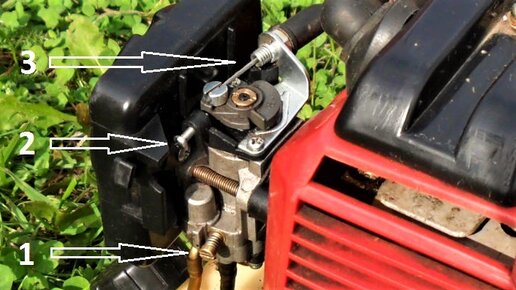 Стандартный карбюратор большинства триммеров выглядит именно так, как на картинке выше... Назначение регулировочных частей карбюратора: Регулировка карбюратора проводится только на запущенном двигателе! Регулировка подачи топлива (винт № 1) Запускаем двигатель и зажимаем полный газ, по чуть-чуть закручиваем винт №1, обороты начинают падать, двигатель захлебывается, затем не отпуская газ потихоньку выкручиваем винт до тех пор, пока обороты на полном газу не станут комфортными. После регулировки отпустите газ и перегазуйте, затем дайте поработать двигателю на холостом ходу 3-5 секунд...