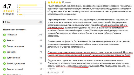 Обычно я не пишу положительные отзывы о нас. Мне нравится разбирать наши отрицательные отзывы, дабы Группа не была пресной. Но на последнем отзыве хочу остановиться, и вот почему? Начну с отзыва: “Решил поделиться своим мнением о недавно посещённом автосервисе. Изначально обратился туда по рекомендации знакомых, которые остались довольны качеством обслуживания. Сам же поначалу относился скептически, так как раньше попадал на недобросовестные сервисы. Первым приятным моментом стало удобное расположение сервиса недалеко от дома, а также возможность предварительно записаться онлайн...