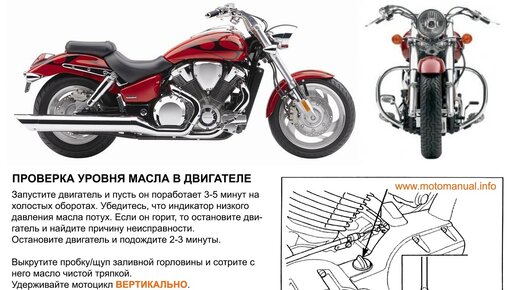 Как его проверять? На вертикальном мотоцикле или на боковой подножке, вкручивать щуп или нет?... На разных мотоциклах это РАЗНАЯ процедура. Внимательно читайте мануал на ваш мотоцикл. Рассмотрим на примере проверки масла на мотоцикле HONDA VTX: