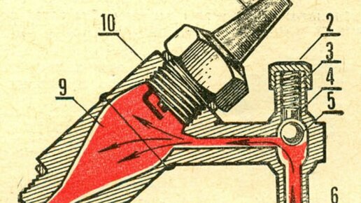 Факельное зажигание для двухтактных двигателей типа М-1-М, М-104, СК-125 создает устойчивый режим работы мотора, предохраняет от детонации и обеспечивает полное сгорание смеси, чем увеличивает мощность примерно на 120/о.  Устройством же факельного зажигания является форкамера — латунный цилиндр, внутри которого имеется грушевидная полость (рис. 1). Она ввернута в гнездо головки цилиндра вместо свечи, а свеча вставляется с другой стороны. Из боковой части форкамеры под углом 45° ведет продувочный канал к шариковому клапану, связанный трубкой с картером двигателя...