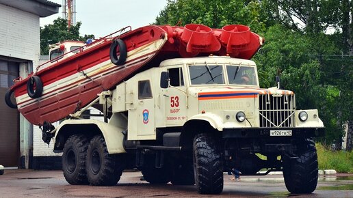 На просторах интернета периодически попадаются фотографии необычного пожарного автомобиля - КРАЗ-255Б с пожарным катером.