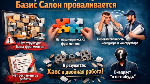 Ряд мебельных компаний сталкиваются с тем, что купили Базис Салон — порядок в бизнесе не появился автоматически. Не появится. Более того — в 70–80% случаев программа начинает усиливать хаос, который уже есть в компании. И проблема не в Базис Салон. Проблема в подходе к внедрению. Самая частая ошибка. Она же присутствует сегодня и без Базис Салон. Компания начинает «наполнять» систему как попало: В итоге формируется не база фрагментов, а набор случайных элементов. И как правило такая "база" очень часто зависит от конкретного конструктора...