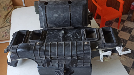 Речь пойдет вот о такой печке. Чтобы ее разобрать ее нужно будет снять с машины, потому как иначе ничего не получится. Снятие печки с машины это отдельная тема. Первым делом снимаем вот эту деталь, которая закрывает тяги приводов заслонок потоков воздуха. Она крепится на трех болтиках, смотрите фото. После, у вас появляется вот такая картина. И тут нужно снять. Вот эти тяги. Можно снять с любой из сторон, главное запомните как они стоят, ну или пользуйтесь фото, на фото они стоят правильно. Снимаются просто, нужно просто потянуть или разжать зажимы и вынуть крепление...