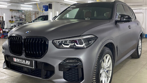 BMW X5 — оклейка кузова матовой виниловой пленкой темносерого цвета, бронирование лобового и монитора, химчистка и шумоизоляция