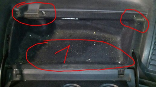 Всё легко и просто! Вам понадобится набор звездочек и пара отверток. Смотрите, на фото в верхней части бардачка четыре шурупа. А в глубине бардачка, так сказать на его дне, имеется хорошо скрытая полость, она обведена под номером 1. Её нужно открыть аккуратно. Вот, открыта это полость и в ней ещё три шурупа...