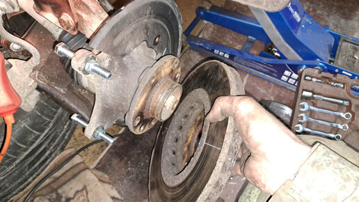 Недавно менял тормозные диски на своем Дастере. Когда дело дошло до демонтажа самого диска, то он отказался сниматься: сильно прикипел к ступице и не хотел с ней расставаться, как только я его не уговаривал. Пришлось постучать по нему молотком. Куда только не бил по нему, минут 15 потратил я на это дело, но диск даже на миллиметр не сошел со своего места. Если меньше слов, то проблему решил при помощи двух болтов и двух гаек. Вставил болты в отверстия через которые крепится тормозная скоба к поворотному кулаку и навернул на них гайки со стороны тормозного диска, как показано на фото...