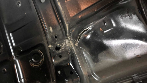 Когда эта Импреза попала в наш кузовной цех, ее хозяйка выглядела очень огорченной. Оказалось, что у машины пробито дно. Как это случилось, девушка держала в секрете, да это и неважно. Нужно было быстро спасать положение. Судя по всему, удар был приличной силы, потому что дно не просто деформировалось, а в добавок образовалось сквозное отверстие. Осенняя грязь начала быстро проникать в салон, и в случае промедления коррозия кузова была бы неизбежна. Повреждение произошло прямо под сиденьем переднего пассажира...