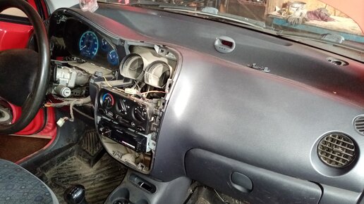 Приветствую дорогие читатели!Сегодня хочу поделится тем,как я менял радиатор отопителя на матизе. Для того что бы добраться до радиатора нужно разобрать всю панель.Но как говорится "глаза боятся, а руки делают"И в последствии,вопреки представлению всё разбирается довольно легко и никаких спец ключей. Ответрка и головка на 10. Итак в первую очередь разбираем центральную часть,она на защелках и саморезах со стороны приборки.Вытаскиваем магнитоллу и блок управления заслонками.Тросы заслонок на скобках...