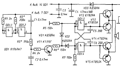 В поисках ультразвука, оказывающего отпугивающее воздействие на животных того или иного вида, нередко строят генераторы, так или иначе варьирующие частоту излучения. Принципиальная схема одного из таких генераторов показана на рисунке ниже. На элементах DD1.3, DD1.4, R5, R7, С5, С6 собран симметричный мультивибратор, частоту которого можно изменять в пределах 25...50 кГц. На эмиттерных повторителях (транзисторы VT2-VT5) собран усилитель мощности, к выходу которого подключен излучатель - высокочастотная динамическая головка ВА1...