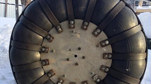 ...самое начало Задача по передним ведущим колесам у меня стояла такая: изготовить два достаточно прочных колеса под камеры без покрышек. Вместо покрышки будет использоваться бандаж из транспортерной ленты, который крепится к диску ремнями на защелках с одной стороны для быстрой и удобной замены камеры в случае прокола. Колеса должны быть достаточно крепкими, так как они ведущие и будут держать весь вес мотоблока плюс часть веса прицепа, иметь грунтозацепы, чтобы не пробуксовывать на подъемах и не...